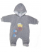 Ciepły watowany pajac niemowlęcy z kapturem polskiego producenta. Pajac zapinany na dwa suwaki, dzięki czemu dziecko można sprawnie ubrać. Pajac dodatkowo pod szyją jest zapięcie na napę, żeby ochronić szyję dziecka przed chłodem. Idealny na chłodne jesienne spacery. Z przodu ozdobiony haftem, rękawy zakończone ściągaczem. Od środka w całości podszyty bawełną.